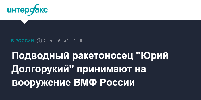 Москва. 30 декабря. ИНТЕРФАКС-АВН - Головной атомный подводный крейсер стратегического назначения "Юрий Долгорукий" проекта 955 "Борей" 30 декабря войдет в состав ВМФ России, сообщили "Интерфаксу-АВН" в оборонно-промышленном комплексе.