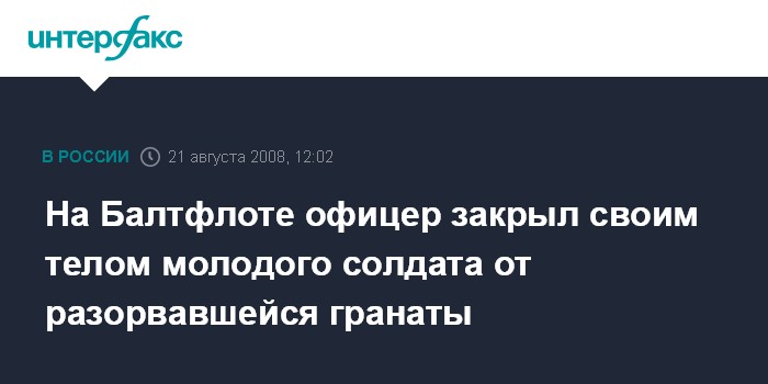 Москва. 21 августа. INTERFAX.RU – Hа Балтийском флоте (БФ) офицер закрыл своим телом молодого солдата от разорвавшейся гранаты, заявил "Интерфаксу" в четверг представитель штаба БФ.