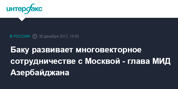 Баку. 30 декабря. INTERFAX.RU - Азербайджан заинтересован во многовекторном сотрудничестве с Россией, заявил глава МИД Азербайджана Эльмар Мамедъяров в интервью журналистам, отвечая на вопрос агентства "Интерфакс-Азербайджан".