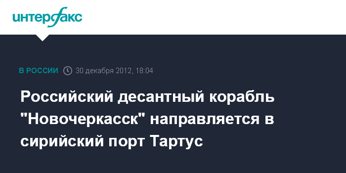 Москва. 30 декабря. INTERFAX.RU - Большой десантный корабль (БДК) Черноморского флота России "Новочеркасск" вышел из Новороссийска и взял курс на восточное Средиземноморье; он направляется в пункт материально-технического обеспечения ВМФ РФ, который расположен в сирийском порту Тартус, сообщил "Интерфаксу-АВН" в воскресенье источник в российском Генштабе.
