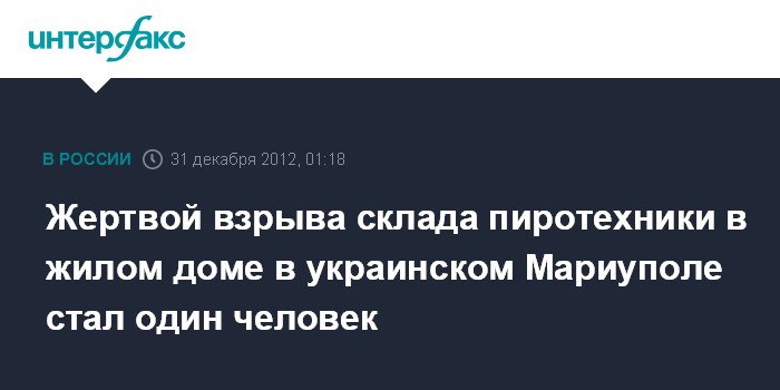 Киев. 31 декабря. ИНТЕРФАКС-УКРАИНА - Склад пиротехники взорвался в воскресенье в одной из квартир жилого дома в городе Мариуполе Донецкой области Украины, один человек погиб, сообщает сайт Мариуполя.