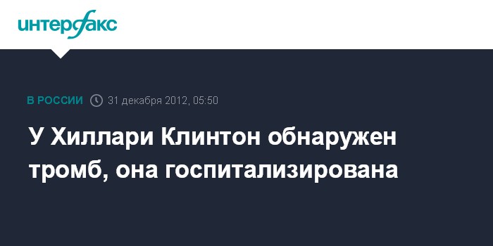 Вашингтон. 31 декабря. ИНТЕРФАКС - Госсекретарь США Хиллари Клинтон была госпитализирована в больницу Нью-Йорка после того, как у нее обнаружили тромб, который образовался после недавнего сотрясения мозга, пишет в понедельник Associated Press.