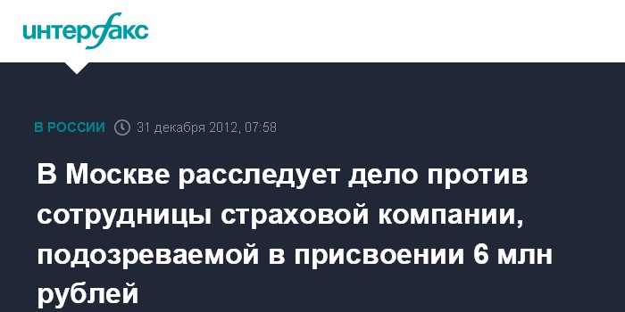"В сентябре текущего года ревизия, проведенная внутри известной российской страховой компании, выявила, что одна из сотрудниц присвоила в период 2009-2010 гг. почти 4,3 млн рублей, которые она получила от клиентов за реализацию страховых продуктов", - сказал сотрудник пресс-службы.