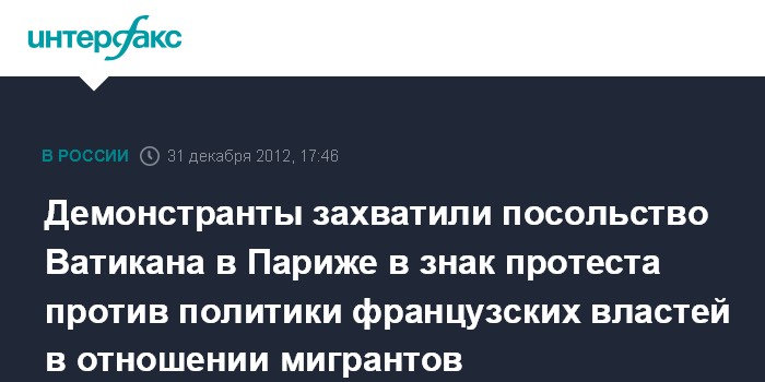 Париж. 31 декабря. INTERFAX.RU - Несколько десятков демонстрантов в понедельник оккупировали здание посольства Ватикана в Париже в попытке поддержать мигрантов, пытающихся добиться от французских властей урегулирования своего статуса, сообщает AFP.