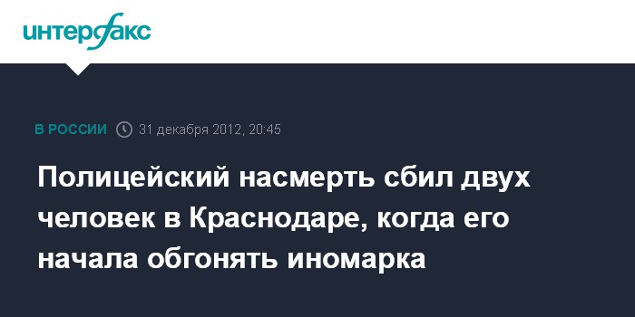 "В правоохранительные органы вечером 30 декабря поступило сообщение о ДТП с участием водителя автомобиля ВАЗ-217230, в результате которого погибло два пешехода. Установлено, что водителем машины являлся оперуполномоченный полиции, в момент происшествия он не находился при исполнении своих должностных обязанностей", - говорится в сообщении на сайте СКР.