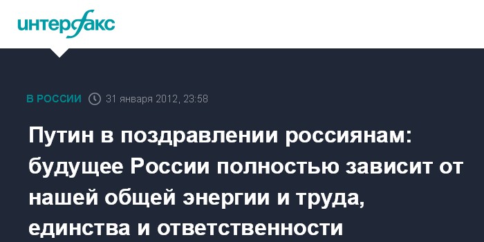 Путин в поздравлении россиянам: будущее России полностью зависит от нашей общей энергии и труда, единства и ответственности