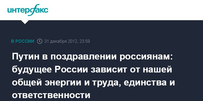 "Встречая будущее, мы, конечно же, надеемся на добрые, радостные перемены. И наши личные планы неотделимы от России, от сердечных, благородных чувств к своей родине. Ее развитие, продолжение ее тысячелетней судьбы полностью зависят от нашей общей энергии и труда. От нашего единства и ответственности. От нашего стремления сделать как можно больше полезного. И только вместе мы - народ России сможем уверенно идти вперед. Противостоять любым испытаниям, решать самые сложные задачи: строить сильное, успешное государство, современное, благополучное и свободное общество", - подчеркнул президент.