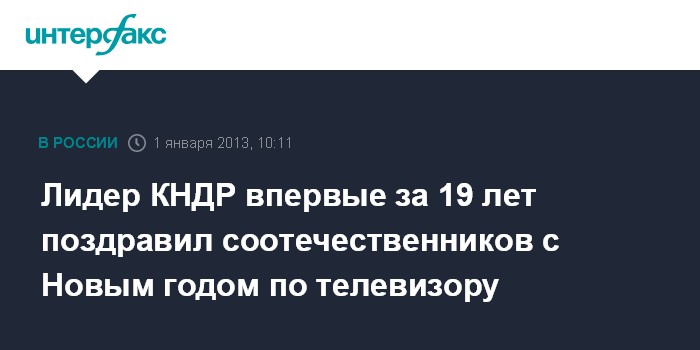 Лондон. 1 января. INTERFAX.RU - Лидер КНДР Ким Чен Ын выступил с новогодним телеобращением к гражданам. Как отмечает британская телерадиокорпорация Би-Би-Си, последнюю новогоднюю речь, которая транслировалась по радио и телевидению, в 1994 году произнес дед нынешнего лидера Ким Ир Сен. Его сын и отец Ким Чен Ына - Ким Чен Ир - крайне редко выступал с публичными речами.