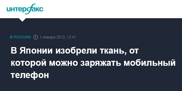 Токио. 1 января. INTERFAX.RU - В Японии изобрели ткань, которая, поглотив достаточное количество солнечной энергии, сможет служить зарядным устройством для мобильного телефона, сообщают во вторник местные СМИ. Владельцу одежды, сшитой из такой ткани, нужно будет лишь включить питание своих джинсов или свитера и присоединить телефон.