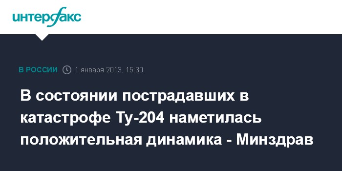 Москва. 1 января. INTERFAX.RU - Состояние троих выживших в катастрофе самолета Ту-204 стабилизировалось, у них положительная динамика, сообщили "Интерфаксу" в понедельник в пресс-службе Минздрава РФ. "Всем пациентам проводится интенсивная терапия", - заявили в министерстве.