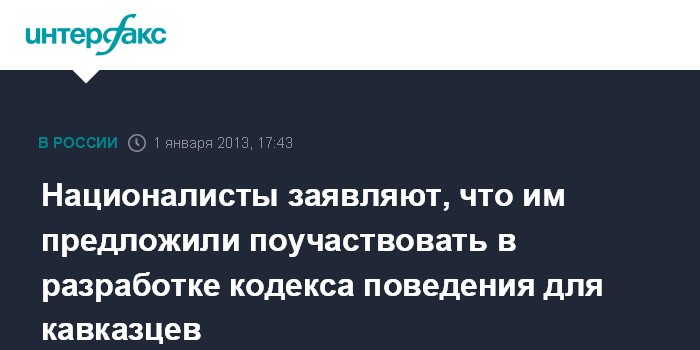 Москва. 1 января. INTERFAX.RU - Представители властей северокавказских республик и местные элиты пригласили националистов поучаствовать в разработке кодекса поведения для уроженцев этих регионов, которые выезжают за их пределы, сообщил лидер объединения "Русские" Дмитрий Демушкин.