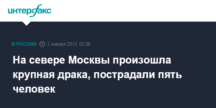 Москва. 2 января. ИНТЕРФАКС - В результате драки на Ленинградском шоссе в Москве пострадали пять человек, сообщили в среду "Интерфаксу" в пресс-службе ГУ МВД РФ по Москве.