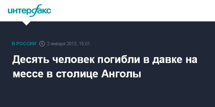 Вашингтон. 2 января. INTERFAX.RU - Не менее 10 человек погибли в давке на стадионе "Сидадела депортива" в столице Анголы Луанде, где проходила служба евангелистов-пятидесятников, сообщает в среду американский телеканал Эн-Би-Си. Среди задавленных есть дети.