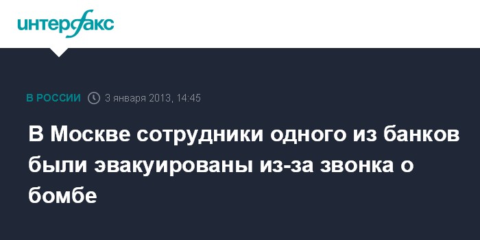 Москва. 3 января. INTERFAX.RU - Из-за угрозы взрыва эвакуированы сотрудники одного из московских банков, сообщил "Интерфаксу" источник в правоохранительных органах. По его словам, поступило сообщение о заложенном взрывном устройстве в здании банка в Волоколамском проезде. Было эвакуировано около 250 сотрудников банков. В настоящее время на место прибыл кинолог, ведется проверка.