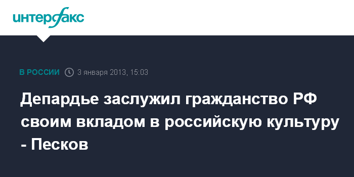 Москва. 3 января. INTERFAX.RU - Предоставление российского гражданства Жерару Депардье связано с весомым вкладом этого актера в развитие российской культуры и кинематографа, заявил пресс-секретарь президента РФ Дмитрий Песков. "Дело в том, что Депардье играл в ряде очень крупных кинопроектов, играл роли, в том числе известна его работа над ролью Распутина - этот фильм еще не вышел на экраны у нас, но это очень смелое и новое озвучивание этой роли", - заявил Д.Песков "Интерфаксу" в четверг.