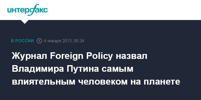Москва. 4 января. ИНТЕРФАКС - Известный американский журнал Foreign Policy назвал самым влиятельным политическим, деловым и общественным деятелем планеты Владимира Путина.