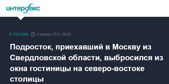 Москва. 4 января. ИНТЕРФАКС - Подросток покончил с собой, выпрыгнув из окна гостиницы на северо-востоке Москвы, сообщил "Интерфаксу" источник в правоохранительных органах.