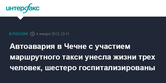 Грозный. 4 января. ИНТЕРФАКС - Три человека погибли и шесть пострадали в Грозном в дорожно-транспортном происшествии с участием пассажирской маршрутки.