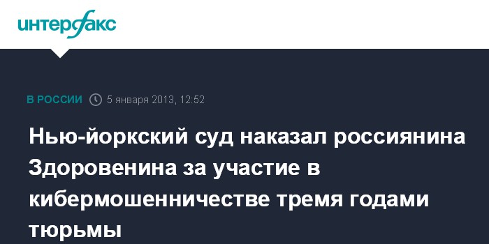 Вашингтон. 5 января. INTERFAX.RU - Нью-йоркский суд приговорил россиянина Владимира Здоровенина к трем годам тюремного заключения по обвинению в кибермошенничестве, сообщает в субботу американский журнал Business Week.