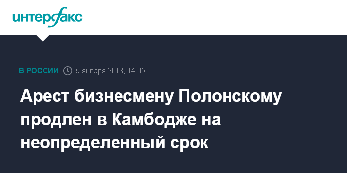 Москва. 5 января. INTERFAX.RU - Суд камбоджийского города Сиануквиль продлил арест бизнесмену из России Сергею Полонскому на неопределенный срок, сообщил "Интерфаксу" в субботу консул РФ в Камбодже Павел Сеськанов.