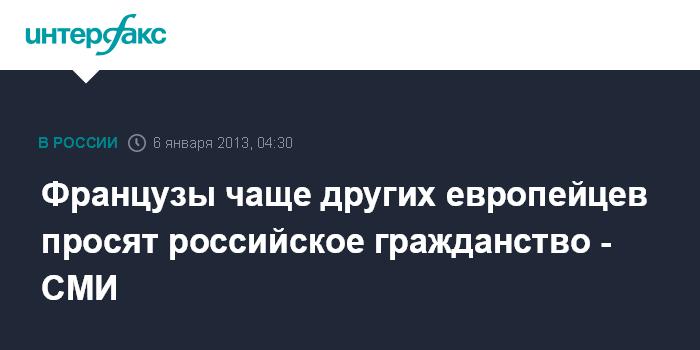 Брюссель. 6 января. ИНТЕРФАКС - Среди европейцев, получивших российское гражданство, больше всего французов, сообщает в воскресенье интернет-сайт бельгийской газеты "Суар" со ссылкой на данные "Евростата".