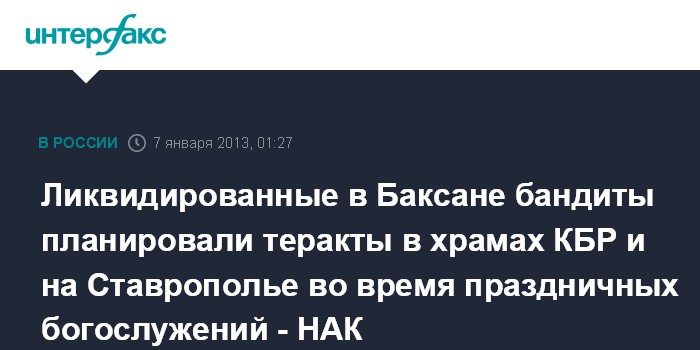 Кроме того, по данным Национального антитеррористического комитета, "управлением ФСБ по КБР была получена оперативная информация о планах бандитов осуществить ряд террористических актов в храмах Кабардино-Балкарии во время проведения 6-8 января многолюдных праздничных богослужений".