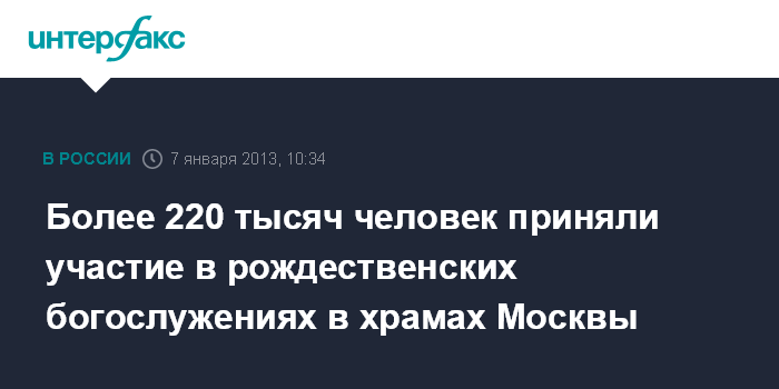 Москва. 7 января. INTERFAX.RU - Более 220 тысяч человек приняли участие в рождественских богослужениях в храмах в ночь с шестого на седьмое января в Москве, сообщили в пресс-службе столичного главка МВД.