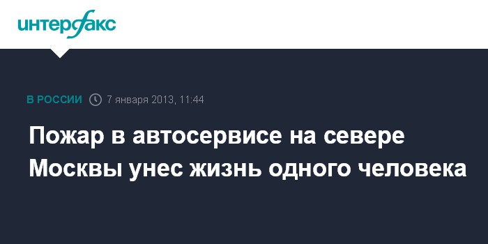 Москва. 7 января. INTERFAX.RU - Один человек стал жертвой пожара в автосервисе на севере столицы, сообщили "Интерфаксу" в пресс-службе ГУ МЧС России по Москве.