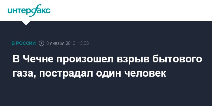 Пятигорск. 8 января. INTERFAX.RU - Во вторник в Чечне произошел взрыв бытового газа, пострадал один человек, сообщили агентству "Интерфакс-Юг" в пресс-службе Северо-Кавказского регионального центра МЧС.