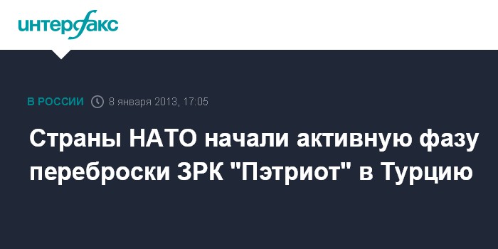 Берлин/Амстердам. 8 января. INTERFAX.RU - Североатлантический альянс начал операцию по переброске в Турцию немецких и голландских зенитно-ракетных комплексов (ЗРК) "Пэтриот", которые будут размещены вдоль границы с Сирией, сообщают местные СМИ.