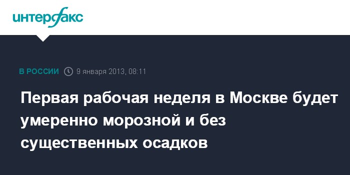 Москва. 9 января. INTERFAX.RU - Пришедшая в Москву морозная погода сохранится в течение первой рабочей недели 2013 года, сообщили "Интерфаксу" в Гидрометеобюро Москвы и Московской области.