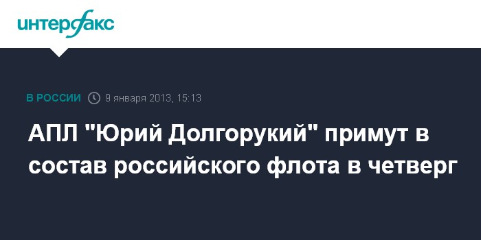 Москва. 9 января. INTERFAX.RU - Ракетный подводный крейсер стратегического назначения "Юрий Долгорукий" в четверг будет принят в состав ВМФ России.
