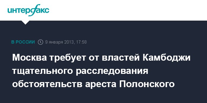 Москва.9 января. INTERFAX.RU - Россия настаивает на проведении объективного расследования ситуации, которая привела к задержанию в Камбодже бизнесмена Сергея Полонского и двух других российских граждан.