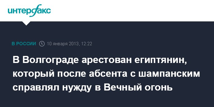 В Волгограде арестован египтянин, который после абсента с шампанским справлял нужду в Вечный огонь