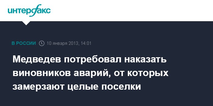 Горки. 10 января. INTERFAX.RU - Виновные в авариях на теплотрассах, приведших к замерзанию целых поселков, должны быть наказаны, заявил премьер-министр РФ Дмитрий Медведев.