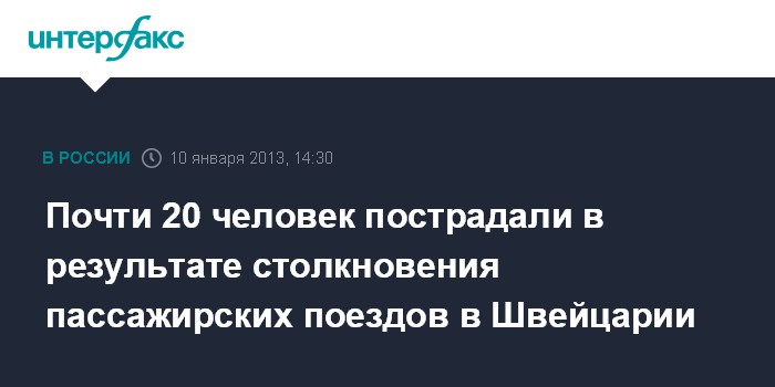 Берн. 10 января. INTERFAX.RU - По меньшей мере 17 человек получили травмы в результате столкновения двух пассажирских поездов на севере Швейцарии близ вокзала города Нойхаузен-ам-Райнфаль, сообщили в четверг в местной полиции.