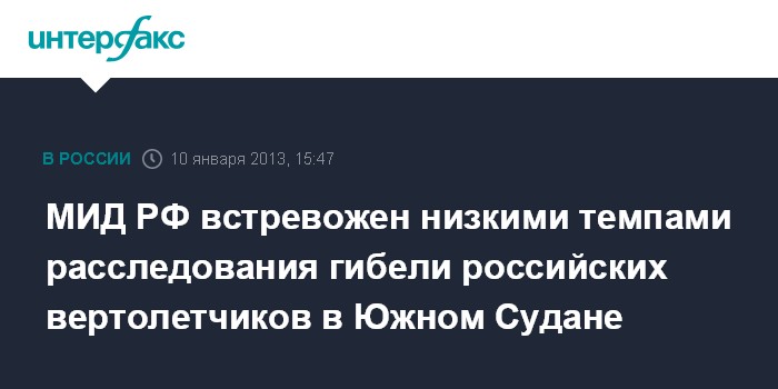 Москва. 10 января. INTERFAX.RU - В Москве обеспокоены затягиванием расследования обстоятельств гибели четырех россиян в Южном Судане и призывают южно-суданскую сторону к немедленному и тщательному выяснению причин катастрофы гражданского вертолета Ми-8.