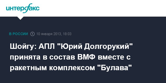 Северодвинск. 10 января. INTERFAX.RU - Стратегическая ракетная атомная подводная лодка "Юрий Долгорукий" класса "Борей" принята в состав Военно- морского флота России вместе с ракетным комплексом "Булава", сообщил министр обороны РФ генерал армии Сергей Шойгу.