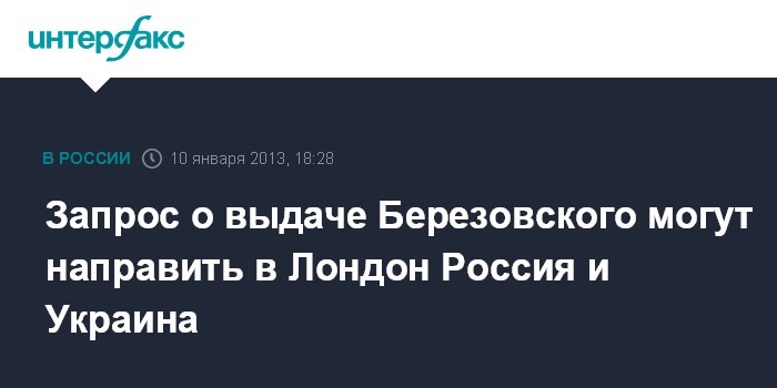 "Думаю, что эта информация (о подготовке теракта в Киеве - ИФ) представляет интерес для правоохранительных органов как России, так и Украины. Если обстоятельства этого потребуют, мы готовы направить в Лондон еще один запрос о выдаче Березовского. Такой запрос может направить как Генпрокуратура России, так и Генпрокуратура Украины", - сказал заместитель генпрокурора РФ Александр Звягинцев в интервью, которое будет опубликовано в "Российской газете" в пятницу.