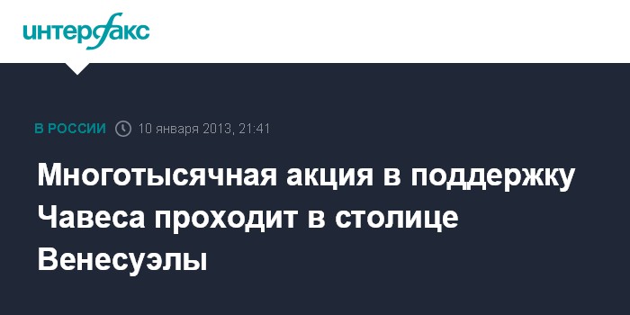 Каракас. 10 января. INTERFAX.RU - Несколько тысяч граждан Венесуэлы участвуют в демонстрации в столице страны Каракасе в поддержку президента Уго Чавеса, сообщает в четверг агентство ЭФЭ.