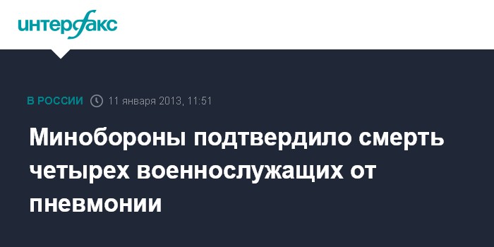 Москва. 11 января. INTERFAX.RU - В Минобороны России подтвердили факты произошедших в декабре 2012 г. - январе 2013 г. летальных исходов течения вирусно-бактериальной пневмонии у четырех военнослужащих, которые проходили службу в различных воинских частях Западного военного округа (ЗВО).