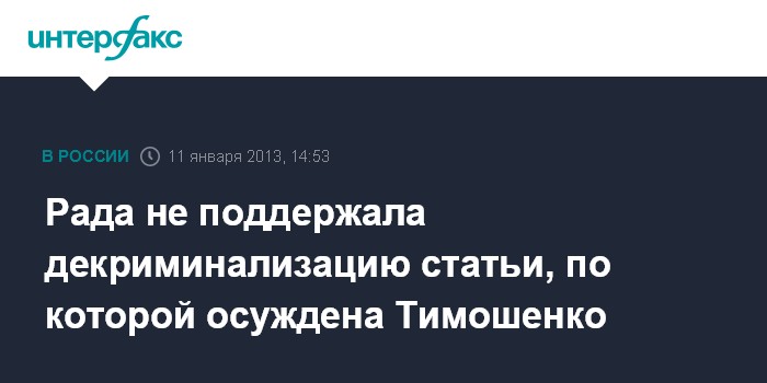 Киев. 11 января. INTERFAX.RU - Верховная Рада Украины вновь отказалась декриминализировать статьи 364 и 365 Уголовного Кодекса Украины, по которым осуждена экс-премьер Юлия Тимошенко.