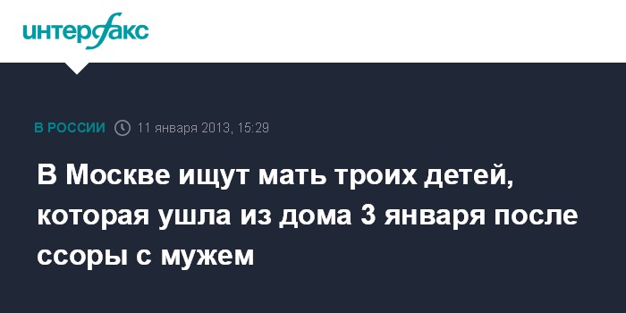 "По данным следствия, 3 января Ирина Кабанова, мать троих детей, после семейного скандала с мужем ушла из дома, расположенного в 1-ом Новоподмосковном переулке. С тех пор о ее местонахождении ничего неизвестно", - говорится в сообщении, размещенном в пятницу на сайте ГСУ Следственного комитета РФ по Москве.