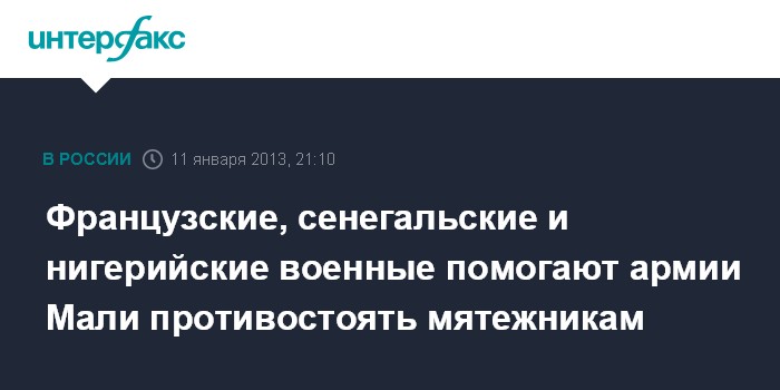 Париж. 11 января. INTERFAX.RU - Малийские военные, ведущие бои против мятежников, уже получают поддержку со стороны находящихся в стране французских, сенегальских и нигерийских военных, заявил полковник Умар Дао, отвечающий в генштабе Мали за планирование военных операций.