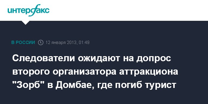 Черкесск. 12 января. INTERFAX.RU - Следствие планирует допросить в субботу второго предполагаемого организатора опасного аттракциона "Зорб" в Домбае (Карачаево-Черкесия), на котором погиб турист, сообщил помощник руководителя СУ СКР по республике Сергей Шуваев.