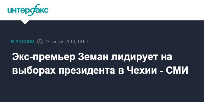 Прага. 12 января. INTERFAX.RU - Кандидат на пост президента Чехии экс-премьер Милош Земан, по предварительным данным, лидирует в первом туре голосования, сообщили в субботу в Чешском статистическом управлении, которое занимается подсчетом голосов.
