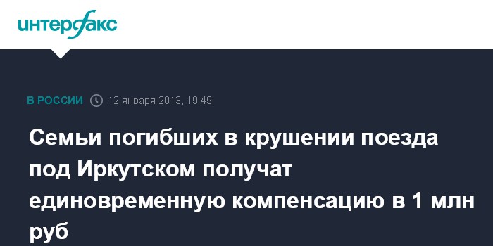 Москва. 12 декабря. ИНТЕРФАКС - Семьям погибших в результате схода с рельсов более 20 вагонов с углем в Иркутской области на участке Слюдянка - Утулик будет выплачено единовременное пособие в размере около 1 млн рублей, а также будет оказана дополнительная материальная помощь от ОАО "РЖД" и ОАО "ФГК".