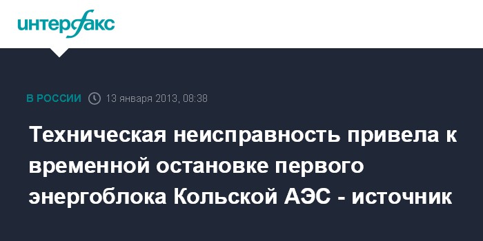 Мурманск. 13 января. ИНТЕРФАКС - В результате технической неисправности первый энергоблок Кольской атомной электростанции был временно остановлен, сообщил "Интерфаксу" источник в правоохранительных органах региона.