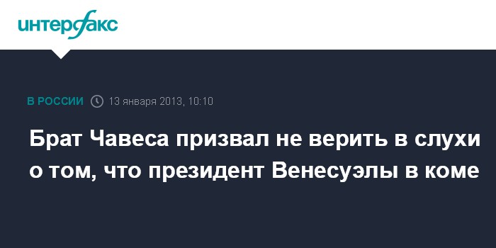 Он призвал не верить в сообщения, распространенные в Интернете, согласно которым У.Чавес близок к смерти. "Появившиеся в социальных сетях и на других ресурсах данные о том, что президент якобы находится в коме, и что его семья обсуждает вопрос о том, следует ли отключать аппараты жизнеобеспечения, совершенно не соответствуют действительности", - подчеркнул А.Чавес.