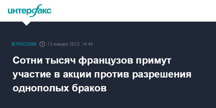 Париж. 13 января. INTERFAX.RU - Около 300 тыс. человек, по данным французской полиции, примут участие в запланированной на воскресенье акции протеста в Париже против разрешения однополых браков, сообщают местные СМИ.